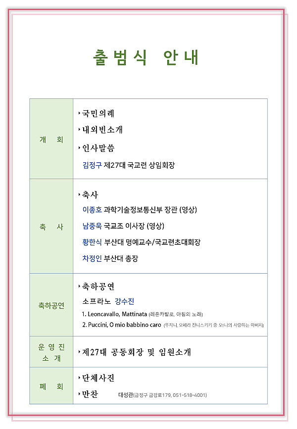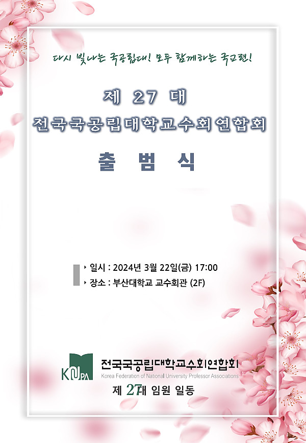 제목 : [2024.03.22] 제27대 국교련 ‘출범식’ 페이지 정보 작성자 국교련 작성일24-09-04 16:24 조회36회 이전글 다음글 목록 본문 일시 : 2024년 3월 22일(금) 17시15분 장소 : 부산대학교 교수회관(2층) 참석자 : 국교련 회장단 회(의)장 및 임원, 국교련 고문, 자문위원 및 정책위원, 국교련 역대 상임회장, 총장, 교원단체 관계자, 국공립대학 교수 등 이전글 다음글 목록