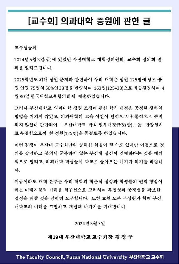 제목 : [2024.05.07] 부산대학교 교수회 의과대학 증원에 관한 글 페이지 정보 작성자 국교련 작성일24-09-03 15:09 조회52회 이전글 다음글 목록 본문 [2024.05.07] 부산대학교 교수회 의과대학 증원에 관한 김정구 교수회장의 글 이전글 다음글 목록