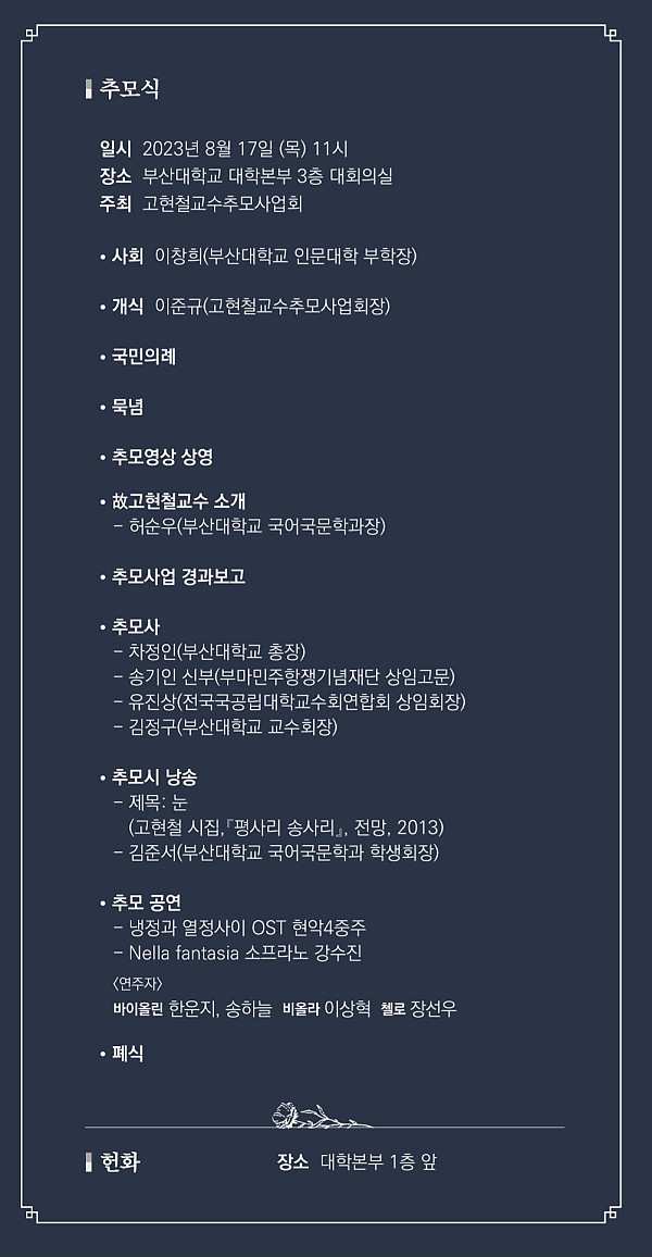 제목 : 故 고현철 교수 8주기 추모식 행사 페이지 정보 작성자 국교련 작성일23-08-24 15:41 조회158회 이전글 다음글 목록 본문 장소_ 부산대학교 대학본부 3층 대회의실 주최_ 고현철교수추모사업회 일시_ 2023년 8월 17일(목) 11시 [이 게시물은 국교련님에 의해 2024-09-04 16:07:34 활동현황에서 복사 됨] 이전글 다음글 목록