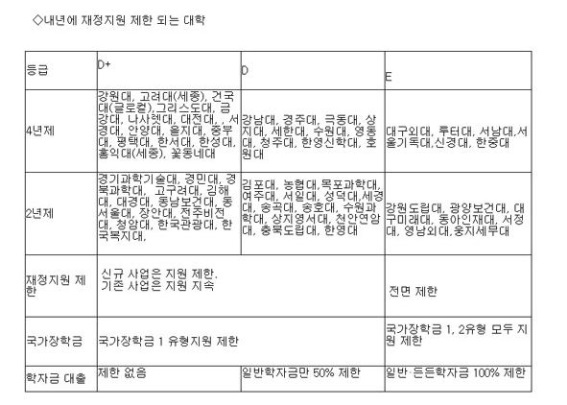 교육부는 이중 D·E등급에 대해선 재정지원을 제한하고 가시적 인원감축 성과가 나와야 2017년에 재정지원을 다시 허용하기로 해 사실상 감축을 강제하기로 했다. 다만 D등급은 이전에 선정됐던 정부재정지원사업만큼은 계속 받을 수 있게 허용했다. 내년에 이들 대학에 들어가는 학생은 대학의 장학금 확보 노력에 비례해 정부가 지원하는 국가장학금2유형을 받을 수 없게 된다. E등급 대학 신입생은 저소득 가정 학생에게 국가가 주는 국가장학금1유형도 받을 수 없다.